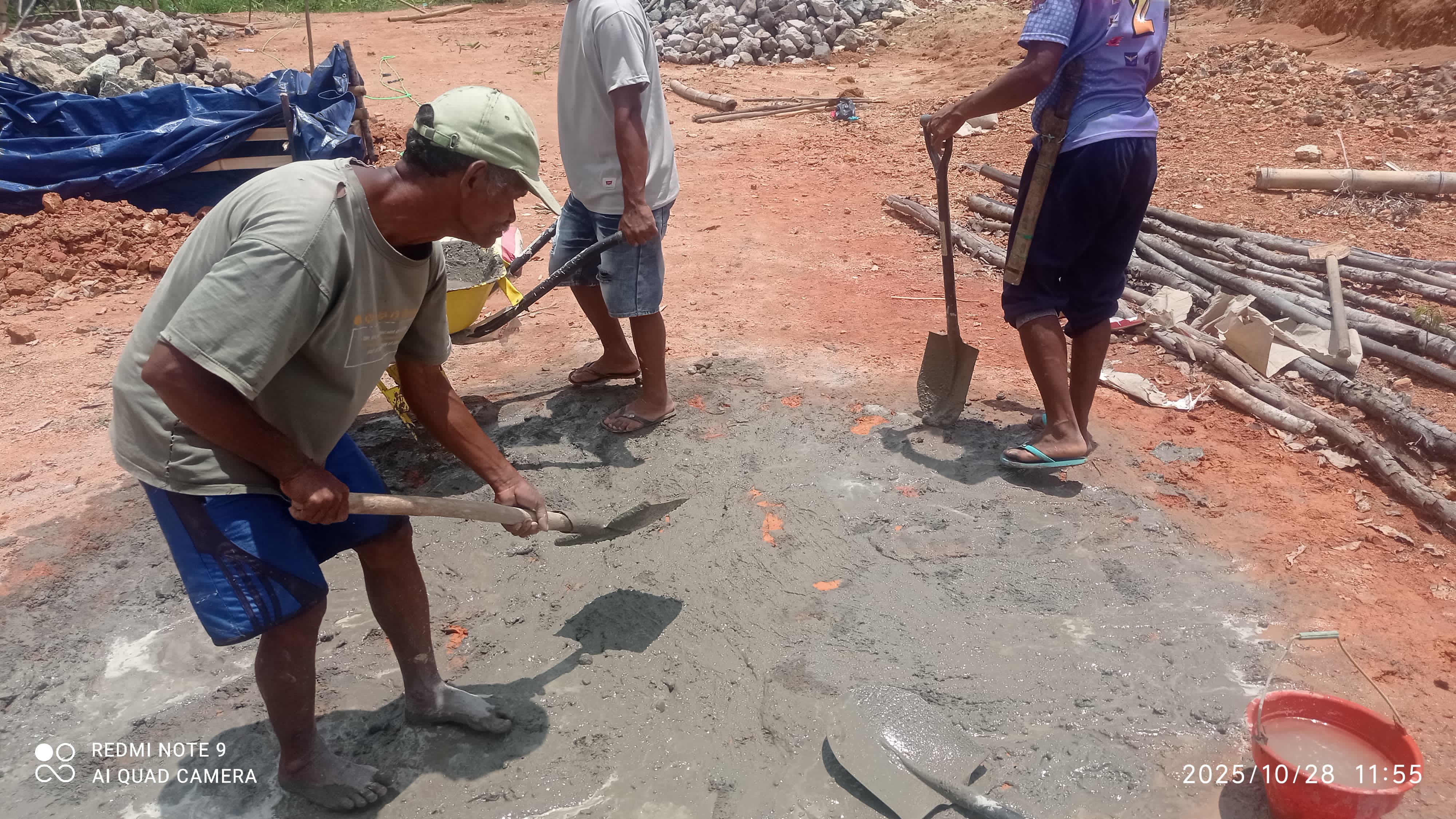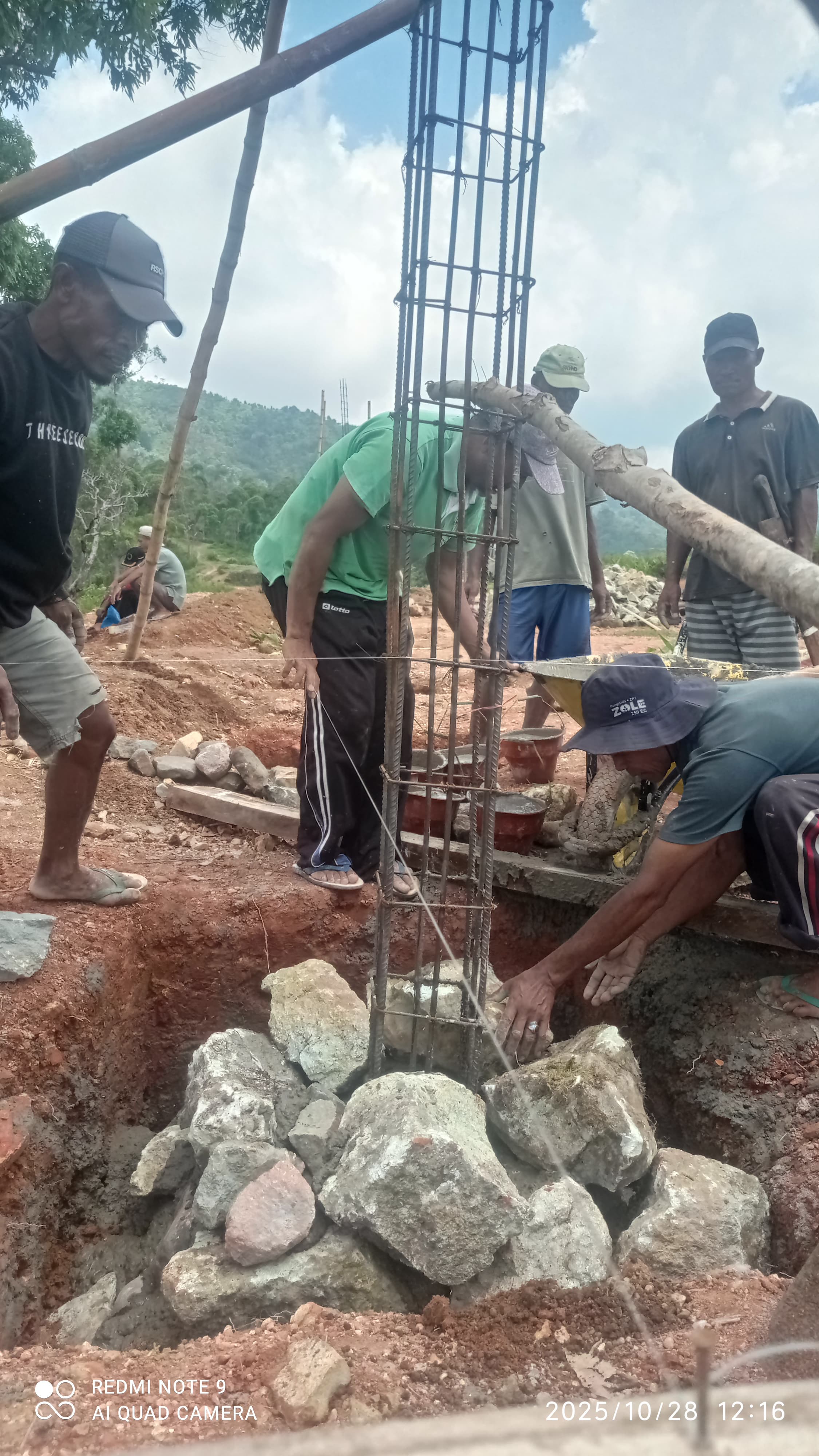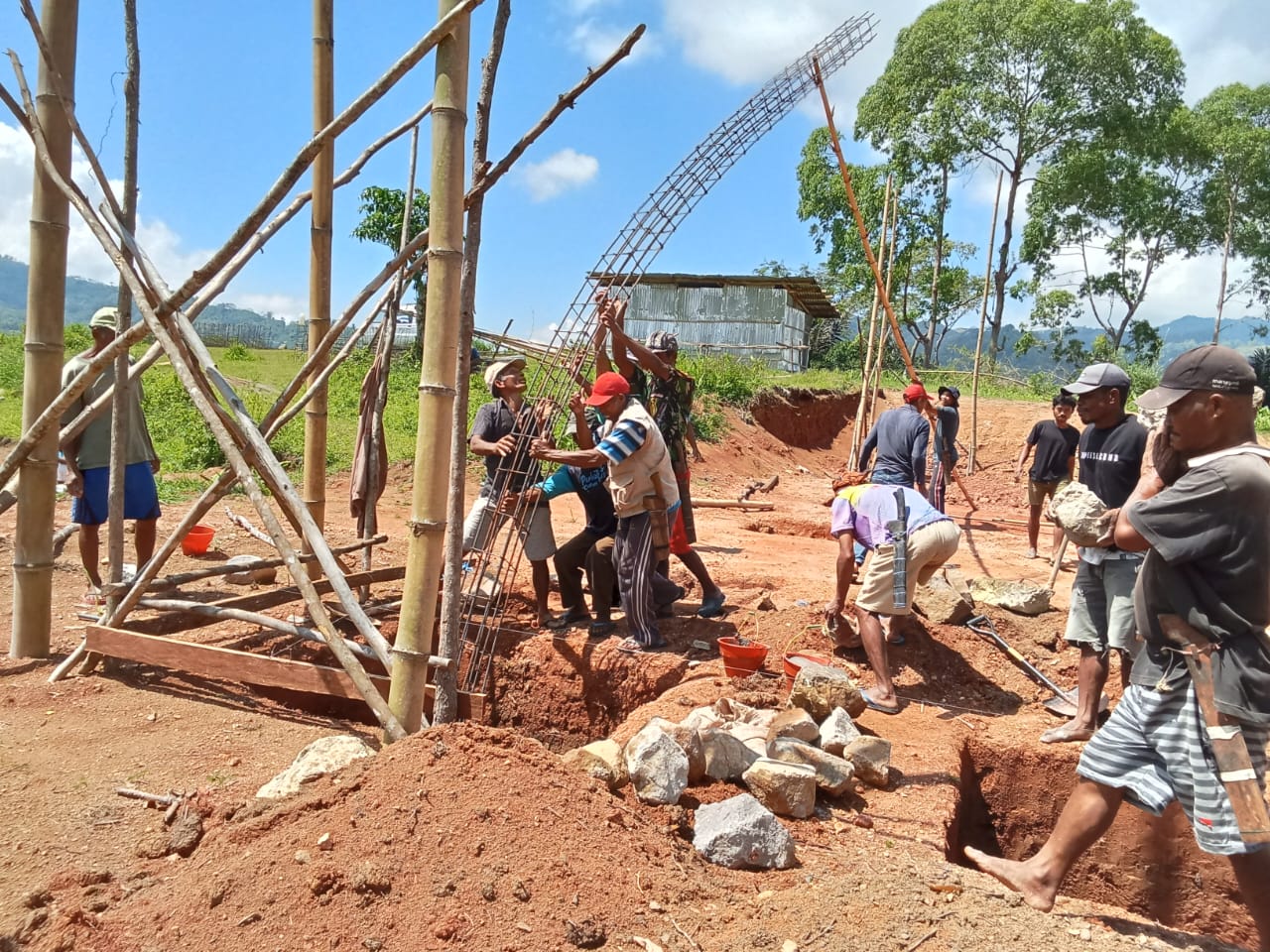 Pemandangan di lokasi pembangunan sungguh membangkitkan semangat. Tua muda, laki-laki perempuan, bahu membahu menggali tanah, mengangkut material, mencampur semen, dan memasang batu pondasi.
